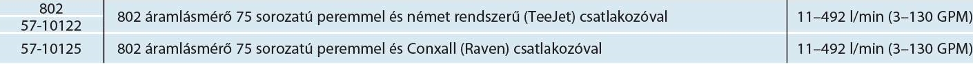 Többféle áramlásmérő választható, amelyek megfelelnek a kijuttatási feladathoz. Áramlásmérők 3 l/perc (0,8 GPM) kapacitástól 1500 l/perc (400 GPM) kapacitásig választhatók különféle stílusokban és csapágyanyagokkal. A 801-es áramlásmérő sokoldalú eszköz, amely a legtöbb kijuttatási alkalmazáshoz megfelel 9,5 l/perc (2,5 GPM) és 227 l/perc (60 GPM) mennyiség között.