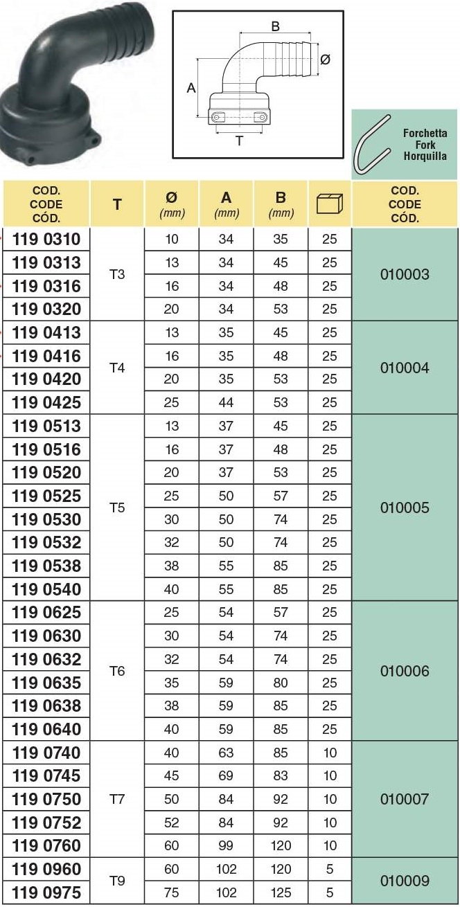 ARAG 90º tömlővéges könyök T csatlakozó (anya) T3-tól T9-ig 10mm-75mm-ig