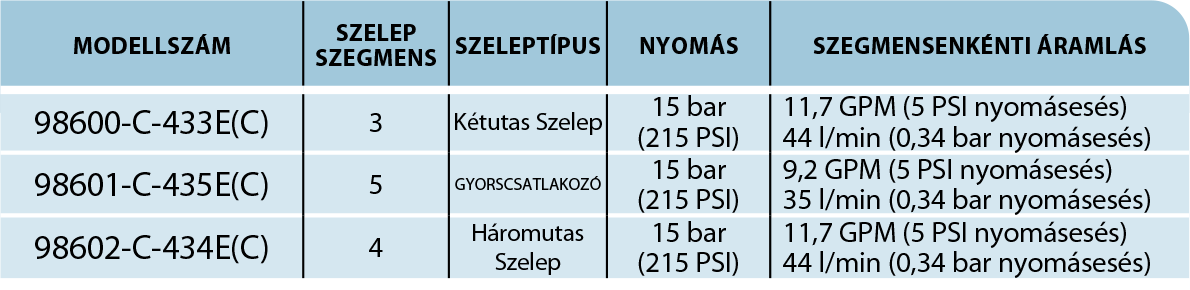 - 2 utas, visszaáramlásos vagy 3 utas szórókeret szakasz szelepek.