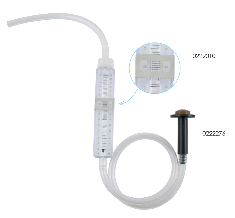 AAMS-SALVARANI passzív átfolyásmérő kijelzőjének eltolható mutatója megkönnyíti az egyes fúvókák által áteresztett permetlémennyiség összehasonlítását. A jól működő fúvókák azonnal kiválaszthatók, mivel ezeknél az átfolyás intenzitását jelző fekete golyó mindig az eltolható mutató ablakában látható. Az átfolyásmérőt nyomjuk rá a fúvókára. A kilépő permetlé innen a mérőhengerbe kerül.