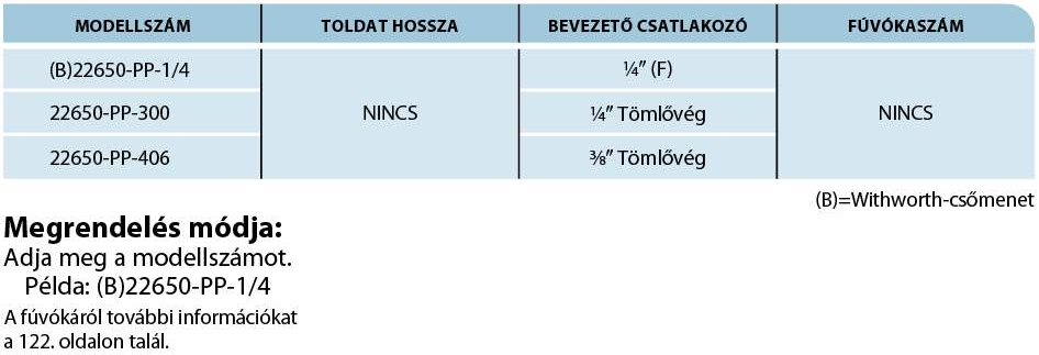 - Catlakozás: 1/4" vagy 3/8" tömlővéges vagy menetes