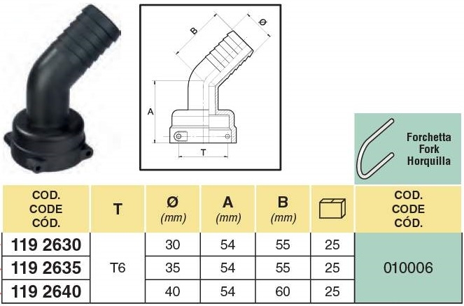 ARAG 45º tömlővéges idom T csatlakozó (anya) T4,T5,T6,T7 25mm-50mm-ig