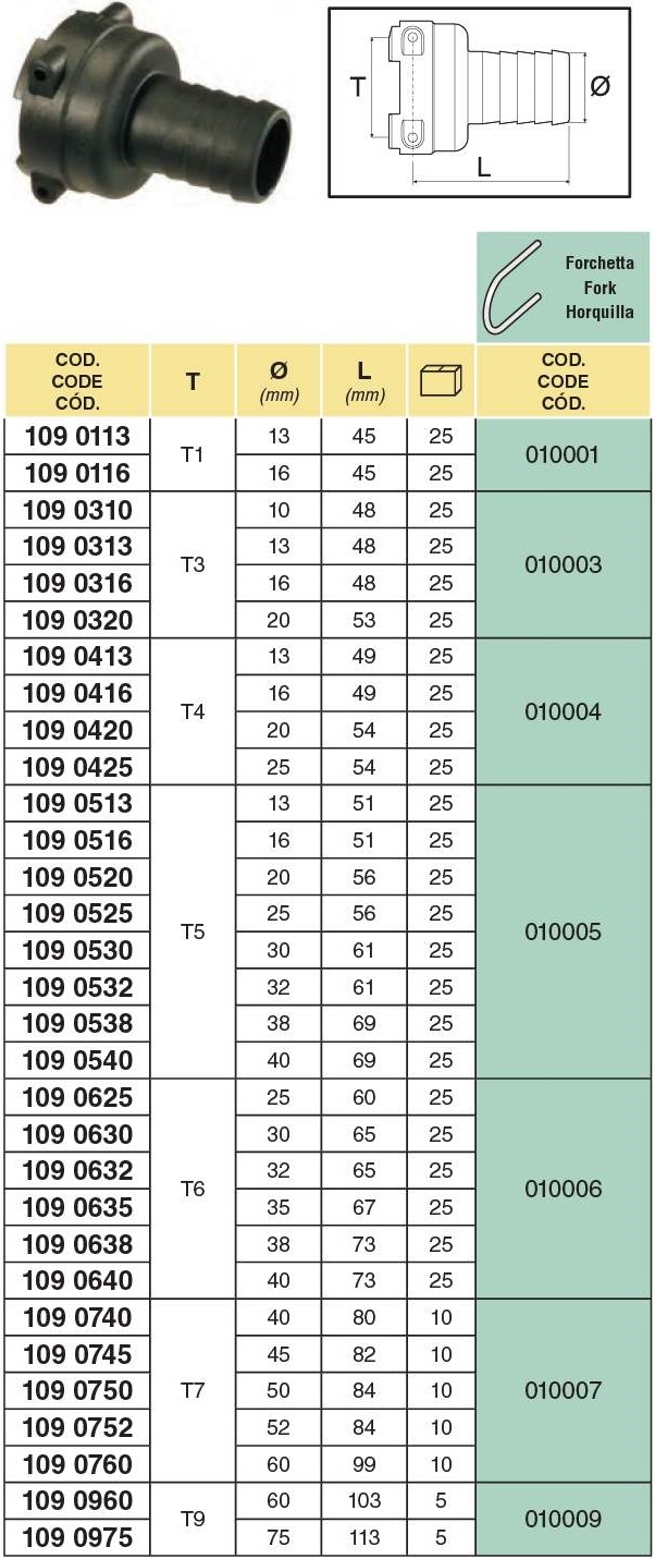 ARAG tömlővéges egyenes T csatlakozó (anya) T1-tól T9-ig 13mm-75mm-ig