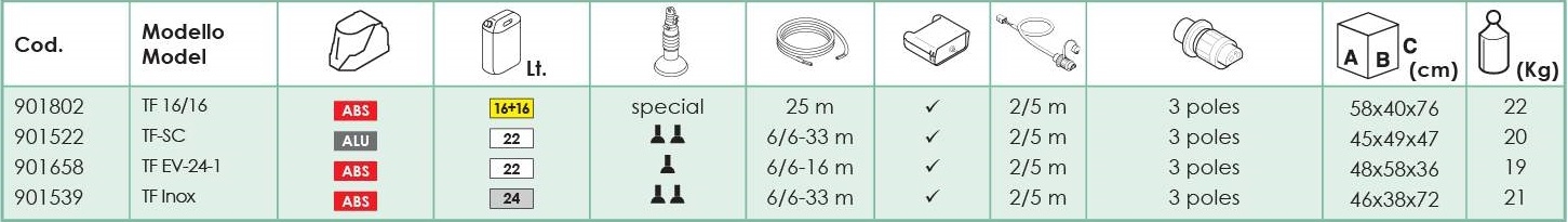 Mindenfajta berendezéshez alkalmas ECO standard tartomány, mostanában fejlesztve: új tartálykivitel, beleértve a szintjelzőt és fogantyút a betöltési eljárás javításához. Kompakt elektromos kapcsolódoboz, beleértve a billenő tartót, biztosítékot és működésjelző LED-et. Tartálysapka műanyag biztonsági szeleppel és nem visszafolyó, nagyon érzékeny membránszeleppel. Hab diffúzor eltávolítható dupla szivaccsal, rugalmas és ellenálló.