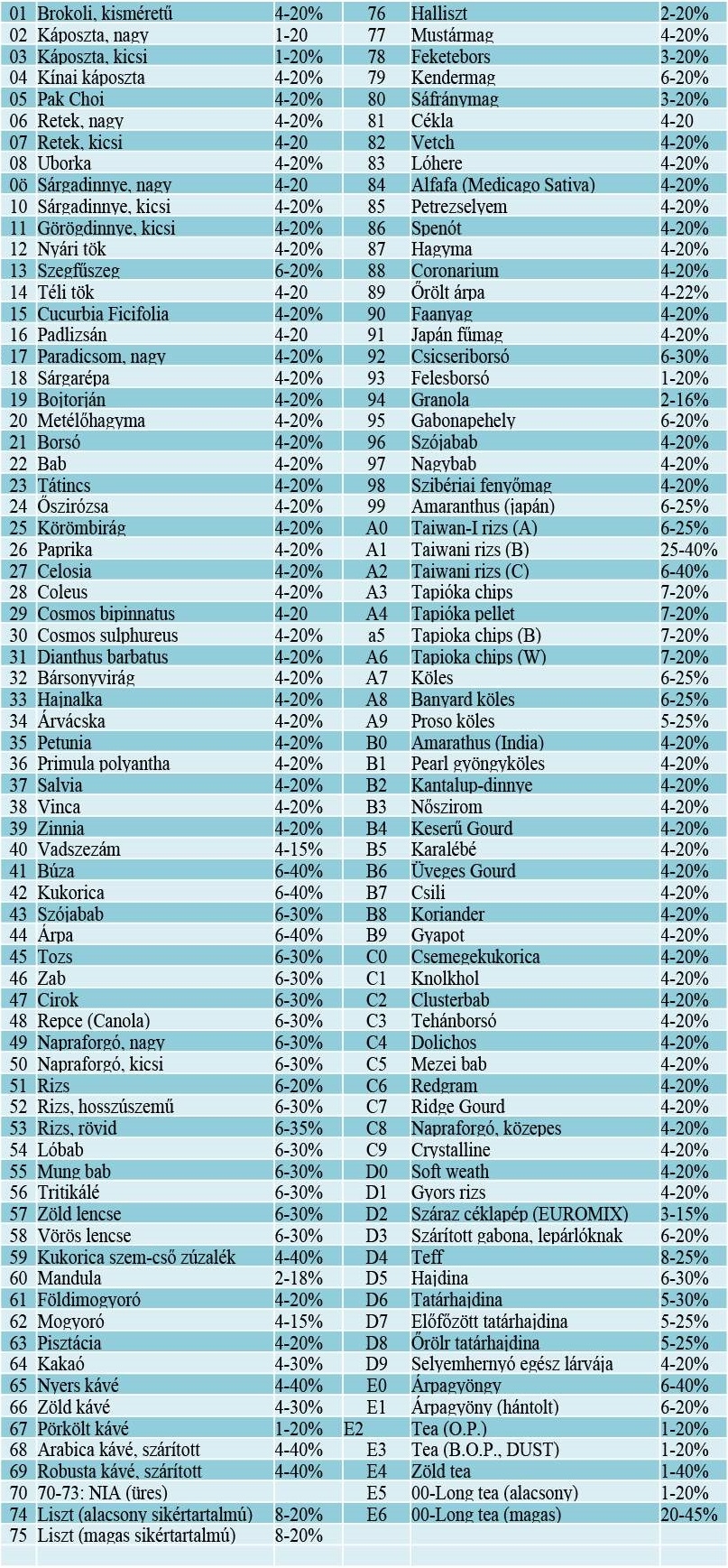 A gabonafélék és magvak nedvességtartalma 1-40% között mérhető, a minta jellegétől és a PM-650 modellváltozatától függően.![]()