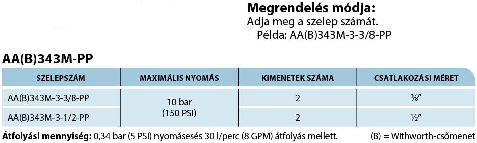 - 3/8" vagy 1/2" amerikai és Withworth belső menetes (BSPT) csatlakozás.