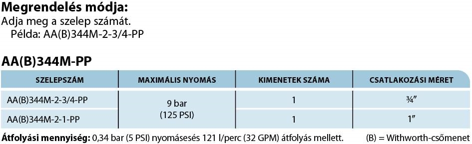 - 3/4" vagy 1" amerikai és Withworth belső menetes (BSPT) csatlakozás.