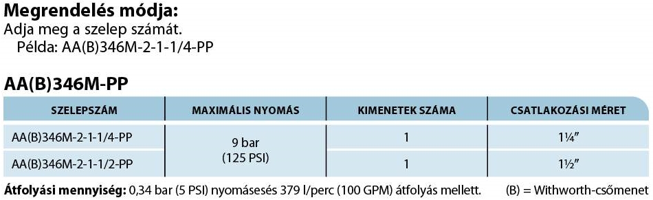 - 1-1/4" vagy 1-1/2" amerikai és Withworth belső menetes (BSPT) csatlakozás.