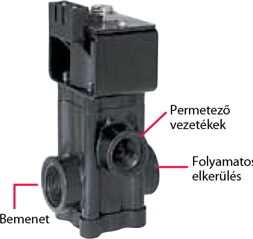 - Folyamatos átfolyású elkerülő csatlakozás a permetező vezeték felé, amelyet szelep "be-ki" műveletek vezérelnek.