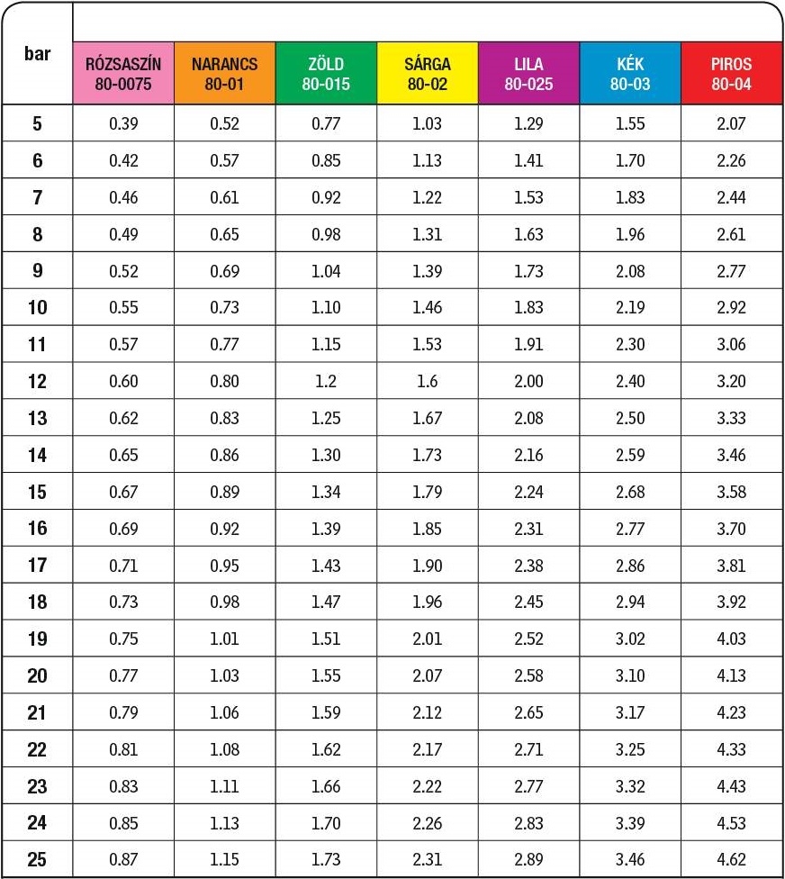 - A fúvókák teljesítménye és színkódja a nemzetközi ISO szabványnak felel meg.
