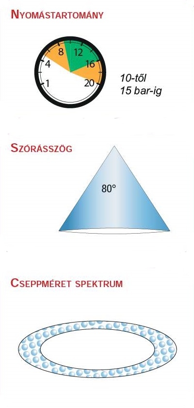 - 80° szórásszög 5 bar üzemi nyomásnál.