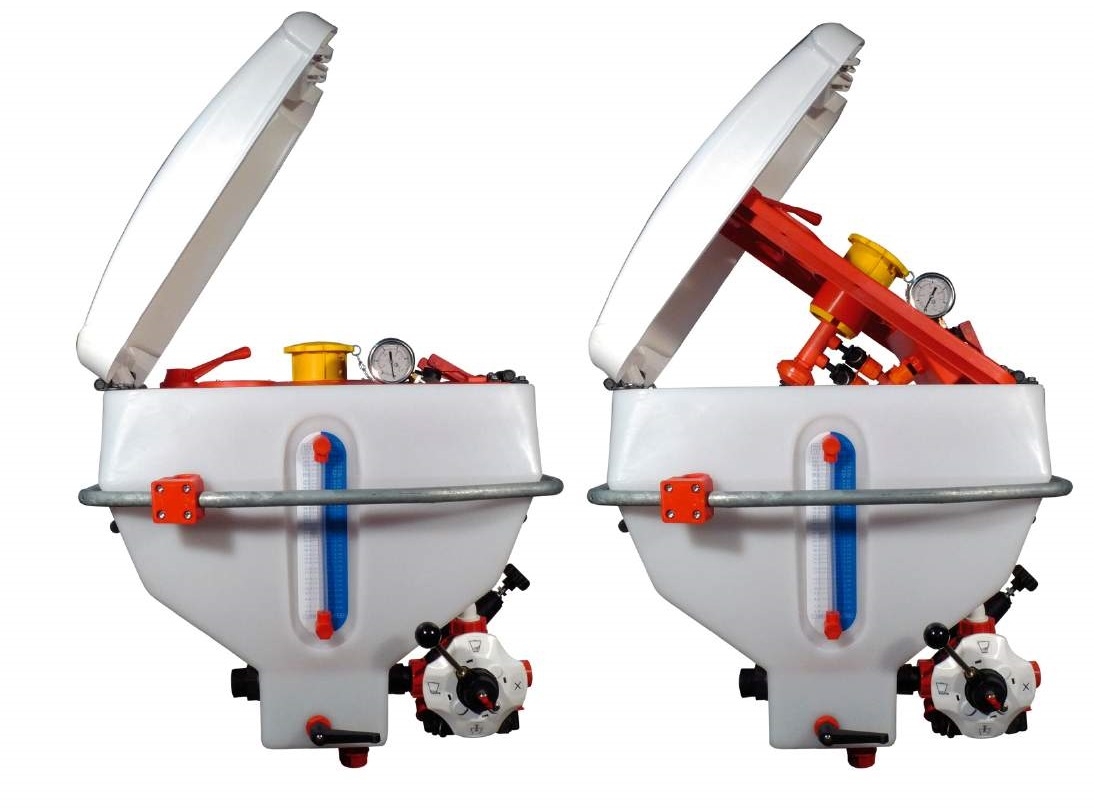 - Tartozékok: gyors betöltő nyílás, rotációs szórófej, bemosó fúvóka, felszívó készlet a vegyszerekhez, vázszerkezet, pisztoly és felszívó tömlő KIT, 5utas golyósszelep, biztonsági szelep