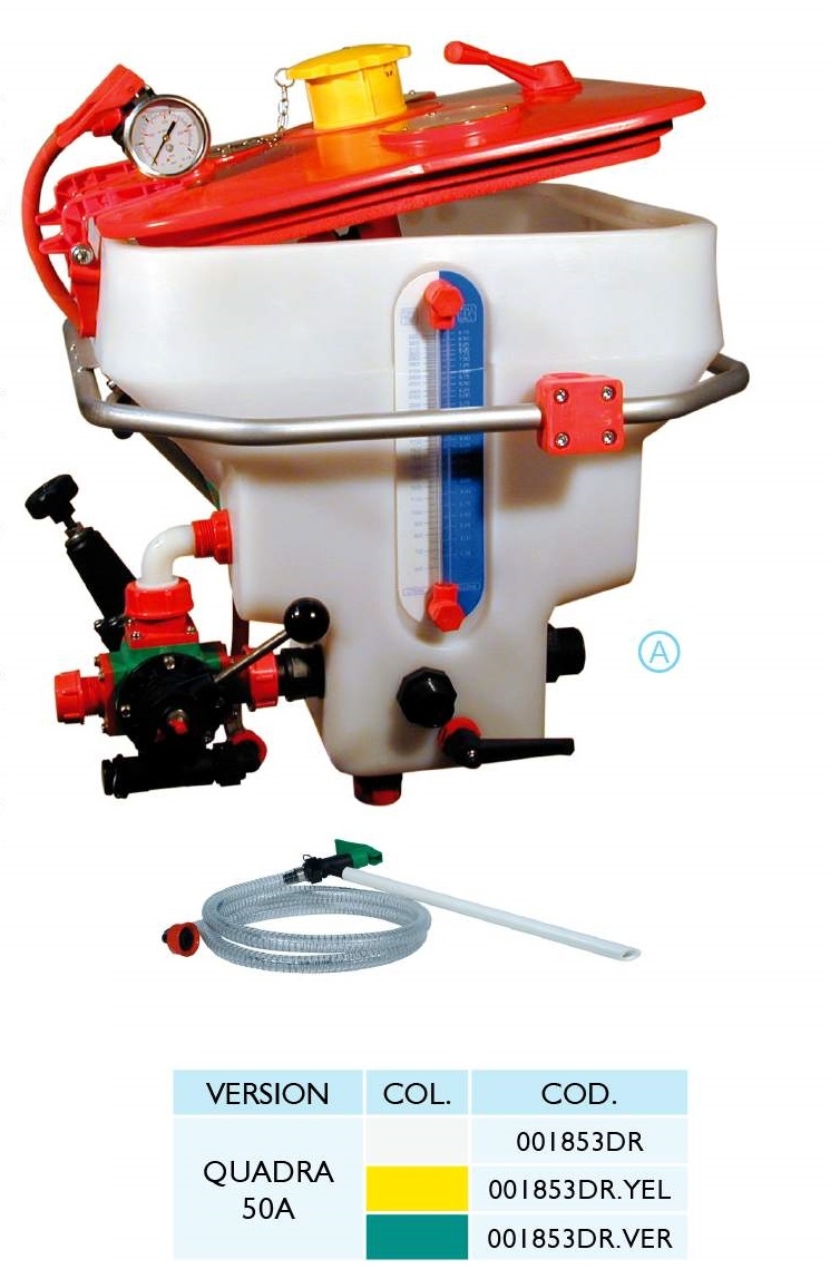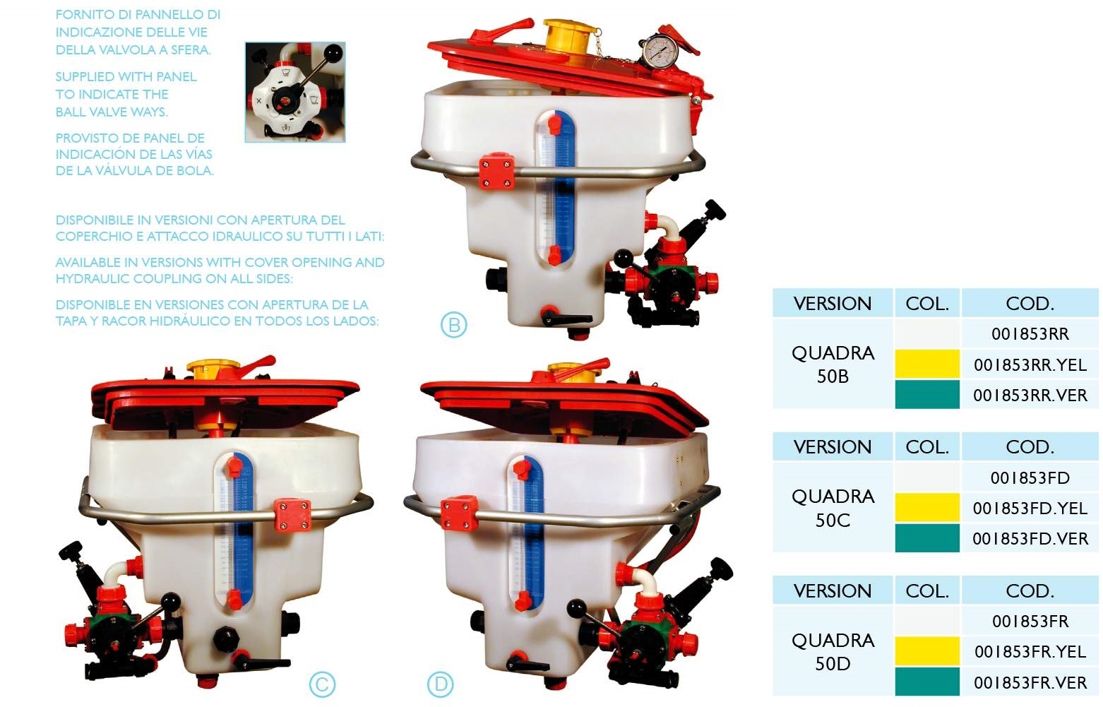 - Tartozékok: minden oldalról nyitható csapófedél, gyors betöltő nyílás, spirális bekeverő rendszer, rotációs szórófej, bemosó fúvóka, felszívó készlet a vegyszerekhez, vázszerkezet, pisztoly és felszívó tömlő KIT, biztonsági szelep